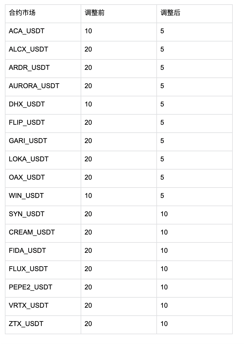 經對合約市場運行及交易情況的評估,Gate.io將于2023年12月4日16:00(UTC 8) 下調部分永續合約最高杠桿倍數,調整如下:
