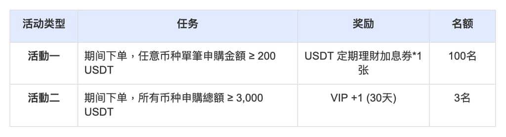 活動期間參與定期理財,前100名可獲得USDT加息券獎勵!所有滿足指定理財交易量的報名用戶,有機會參與 VIP 1 抽獎,享受 30 天獨家尊榮福利!歡迎參與!