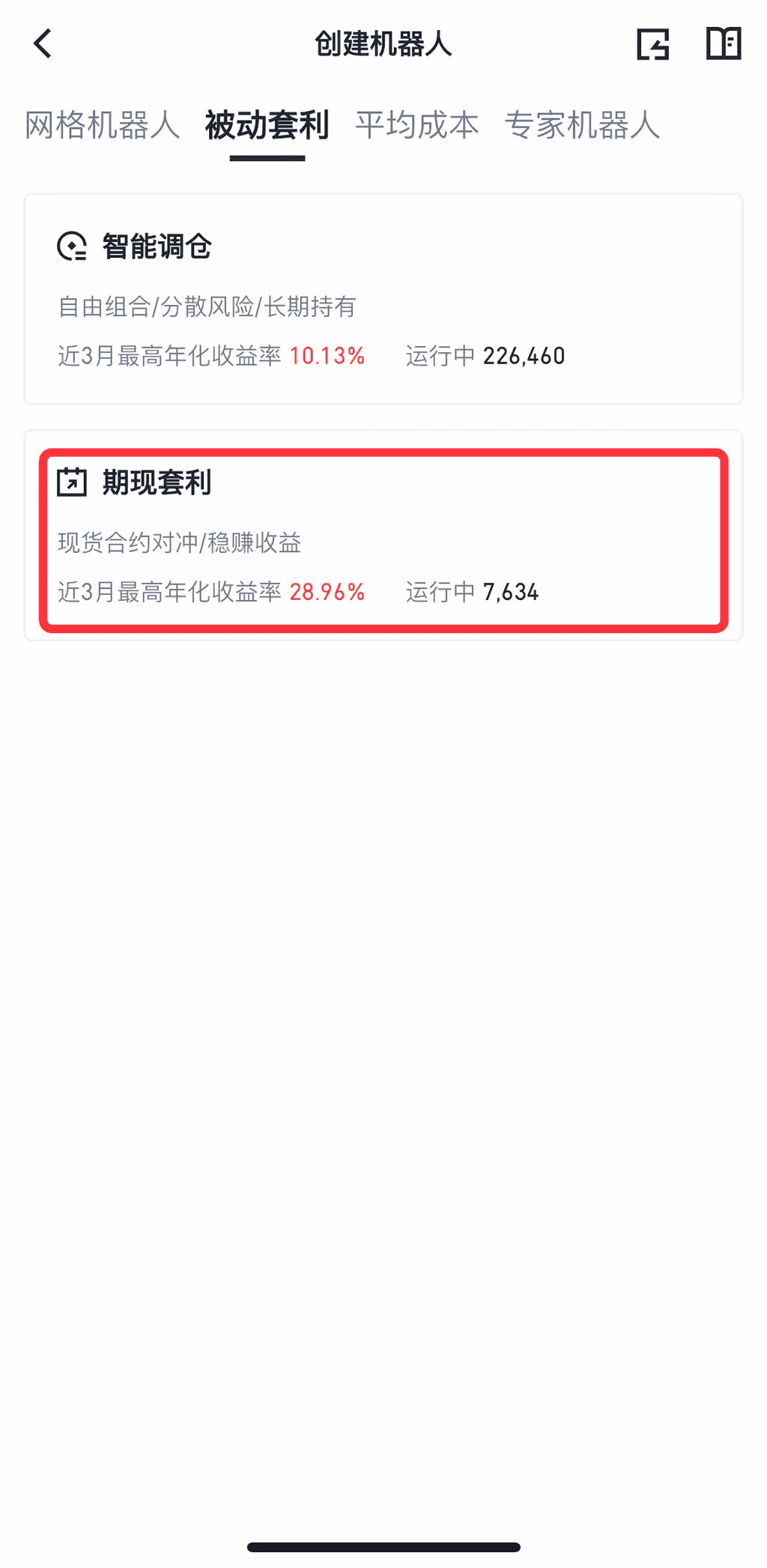 交易機器人主頁—創建機器人—被動套利—期現套利—創建機器人