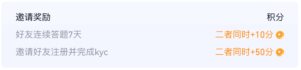 活動流程:a. 進入活動頁面,報名活動b. 閱讀相關文章,牢記知識點c. 每日可參與答題或邀請新用戶任務獲取積分d. 邀請好友共同參加,完成分享任務&好友為新用戶,都會獲得更高獎勵e. 活動結束后,獎勵將根據您累積積分發放至錢包賬戶