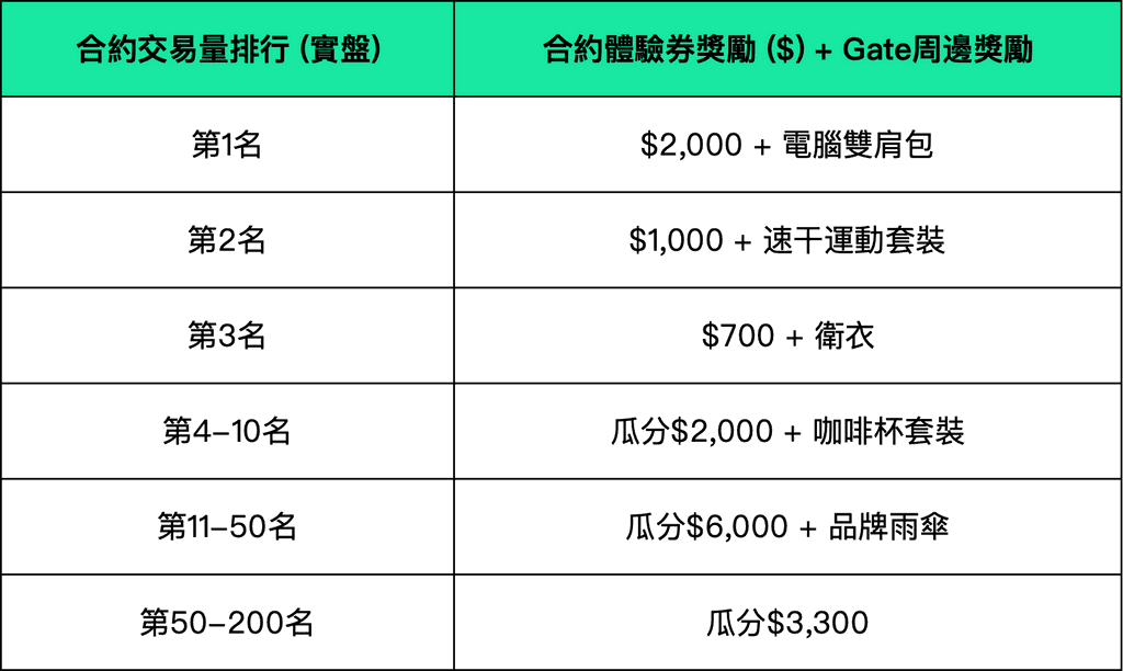 ➣ 活動二:首次合約實戰交易,瓜分$15,000,眾多Gate周邊等您拿!活動期間,用戶在合約模擬盤中體驗交易後,前往實盤完成【首次合約交易】,將按實盤中的累計交易量進行排名,累計瓜分$15,000和眾多Gate周邊。詳情如下: