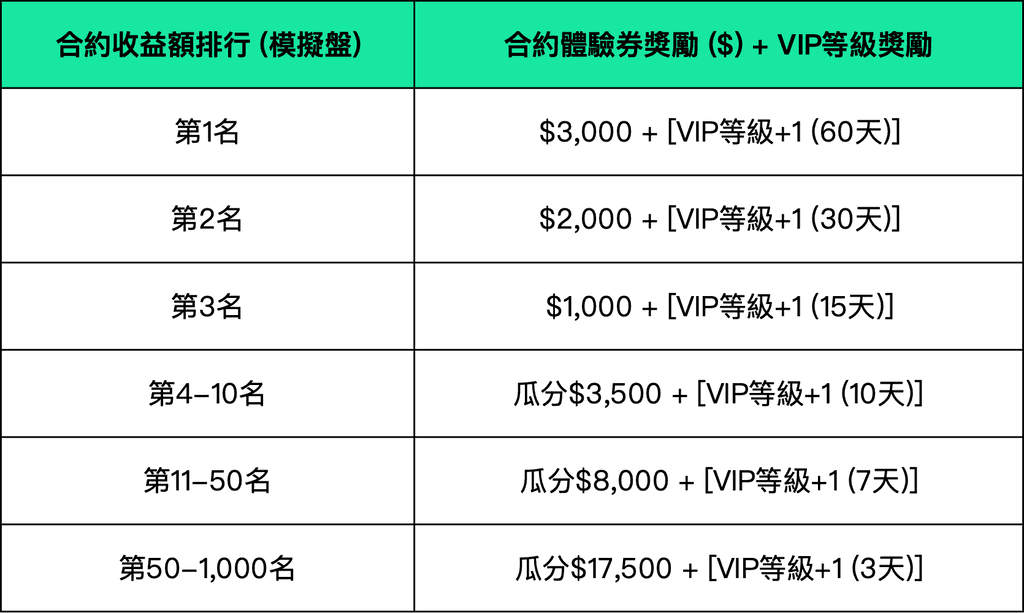 ➣ 活動一:合約模擬盤交易,單人最高得$3,000 [VIP 1 (60天)](1) 活動期間,用戶在合約模擬盤中進行交易,根據單個用戶的【模擬收益額】排名,累計瓜分$35,000獎勵,詳情如下: