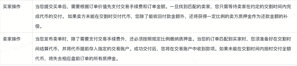 注:買賣雙方需提前支付交易手續費,賣方須根據質押率支付質押金額以保障及時結算。質押金將在交割成功后返還。所有交易均以 USDT 計價。