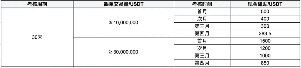 Gate.io將于每月底,根據上一月新報名的帶單交易數據情況發放現金補貼。成為帶單員的前4個月,達成以下條件的達人將獲得官方現金補貼(最高1500 USDT)。