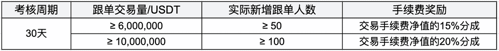 注:跟單手續費返傭為交易手續費扣除邀請返傭和負maker之后的手續費凈值,通過帶單員自有社區用戶數帶來的交易量不計入活動產生的手續費。(凈手續費返傭=交易手續費 - 負maker手續費 - 邀請返傭手續費)。跟單手續費以跟單用戶的總交易量為基礎,即使不是您邀請的用戶跟單,也會計算交易量。