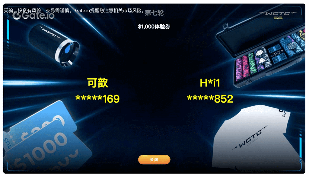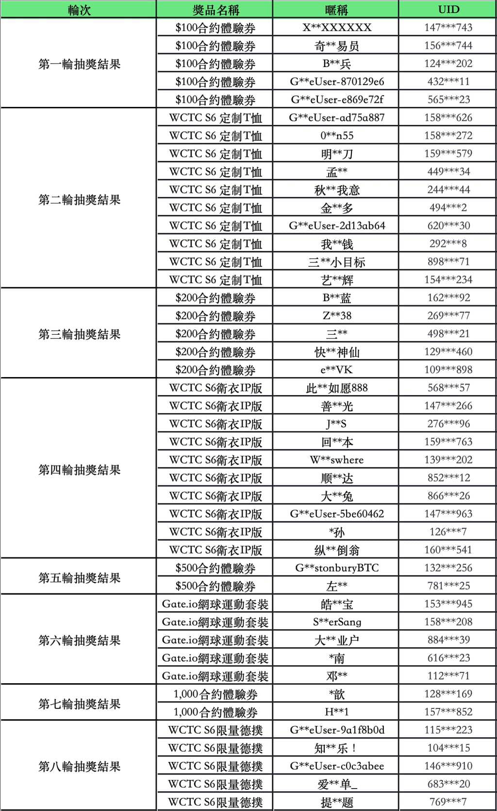 「WCTC S6直播抽獎終極場」第三場直播抽獎活動已圓滿結束,感謝每一位用戶的關注與參與,同時也感謝特邀嘉賓們為我們帶來精彩的直播內容。經過八輪公開透明直播抽獎,總計44位用戶獲得獎勵,其中5位用戶獲得$100合約體驗券;10位用戶獲得WCTC定制T恤;5位用戶獲得$200合約體驗券;10位用戶獲得WCTC衛衣IP版;2位用戶獲得$500合約體驗券;5位用戶獲得Gate.io網球運動套裝;2位用戶獲得$1,000合約體驗券;5位用戶獲得WCTC限量德撲;在此恭喜獲得獎勵的幸運兒!