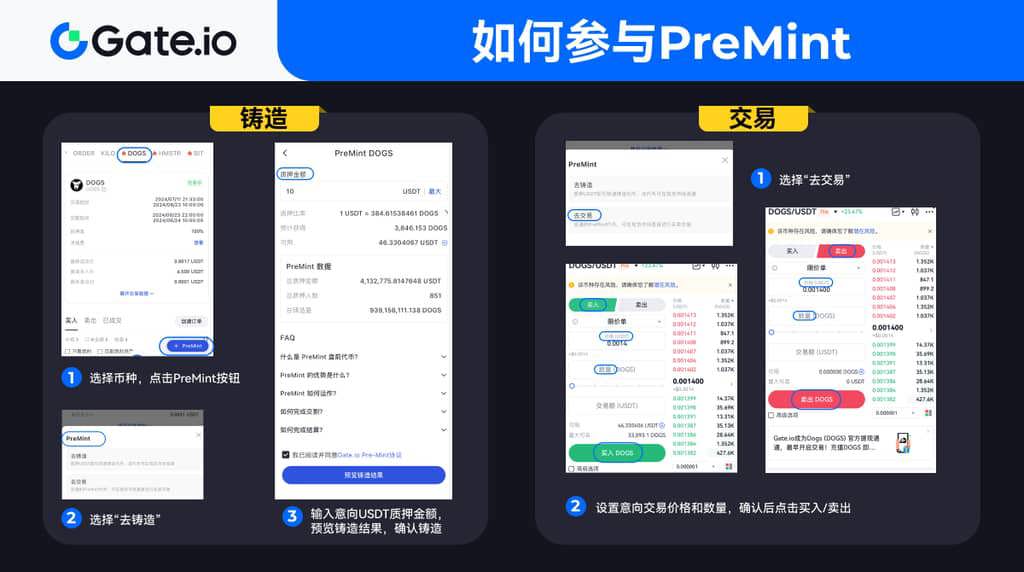 首先,訪問Gate.io官網并選擇盤前交易,選擇DOGS幣種后點擊PreMint按鈕。在彈出的PreMint窗口中,選擇“去鑄造”。接著,在信息彈窗中輸入計劃質押的USDT金額,預覽鑄造結果,確認無誤后點擊確認鑄造。鑄造或充值完成后,用戶可以繼續進行PreMint交易以提前獲利。再次訪問Gate.io官網并選擇盤前交易,選擇DOGS幣種并點擊PreMint按鈕。在彈出的PreMint窗口中,選擇“去交易”。然后,設置期望的交易價格和數量,確認后點擊買入或賣出即可。