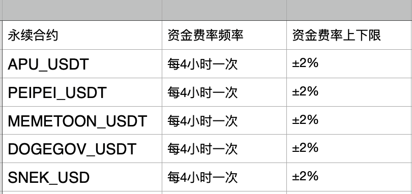 Gate.io已上線APU, PEIPEI, MEMETOON, DOGEGOV, SNEK永續合約實盤交易(USDT結算),支持1-50倍做多和做空操作,杠桿率可以在下單時自行選擇。資金費率頻率爲每4小時一次,資金費率上下限±2%