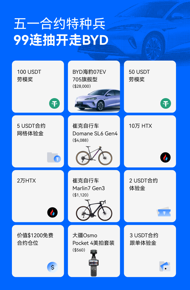 在景區看人山人海,不如在合約斬獲金山銀山,火幣HTX“五一特種兵”集結號已吹響,每筆交易都是機會,99連抽橫掃轉盤抽獎!BYD海豹07EV、崔克頂級自行車、大疆Osmo Pocket 4……海量豪禮已入庫,只等王牌勞模認領。