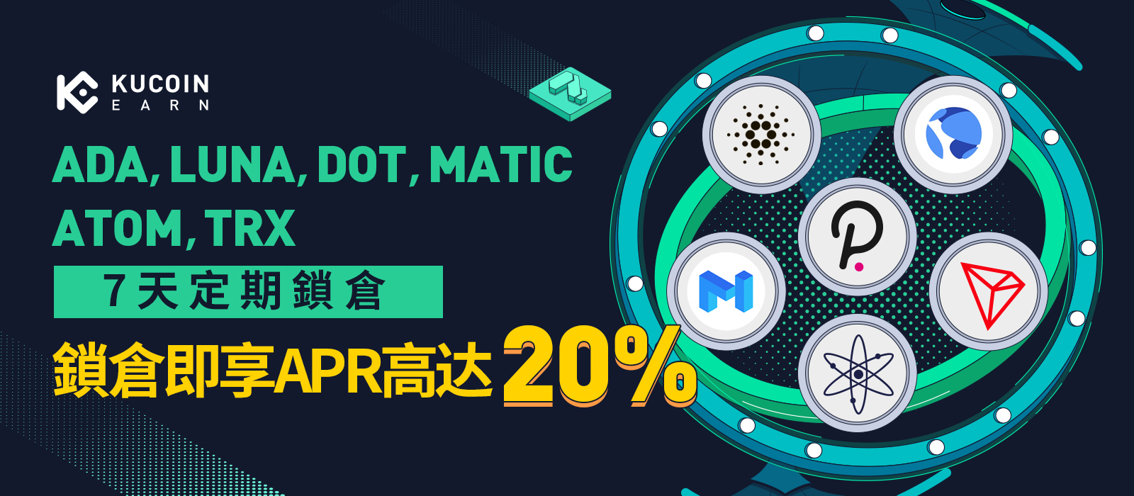 KuCoin賺幣平臺將於2022年4月13日18:00:00 (UTC 8)上線ADA/LUNA/DOT/MATIC/ATOM/TRX 7天定期鎖倉活動,本次上線產品最高享20%福利!