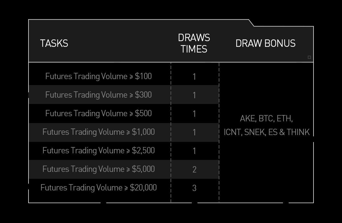 在活動期間,首次參與合約交易的用戶只需達到任意一個合約交易量門檻,即可獲得相應的抽獎資格,並瓜分 $100K 獎池,包含 AKE、BTC、ETH 等熱門代幣!