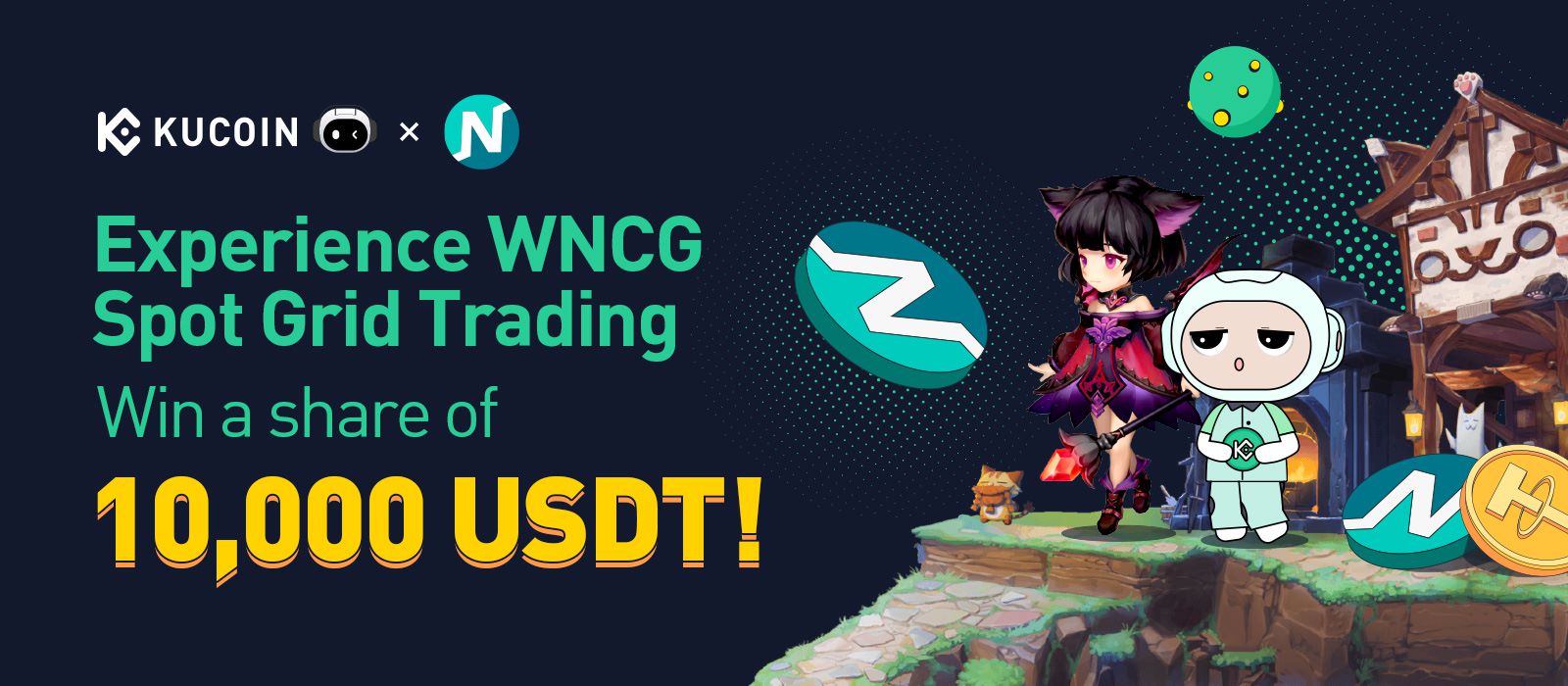 為感謝各位用戶一直以來對KuCoin交易機器人的支持 ,我們將推出“體驗WNCG現貨網格交易:瓜分10,000 USDT!”活動。