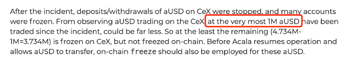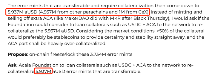 對于已經在 CEX 上交易的 aUSD 錯誤鑄幣,建議讓 Acala 基金會將 USDC ACA 等抵押品借入網絡進行重新抵押