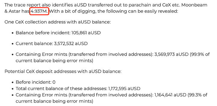 Acala 基金會近期公布了完整追蹤報告,Acala 社區也基于該報告發起了aUSD 恢復提案。然而發現提案中很多與 CEX 相關的重要信息并不準確,例如發送給 KuCoin 的 aUSD 錯幣數量、在 KuCoin 上交易的 aUSD 錯幣數量等。