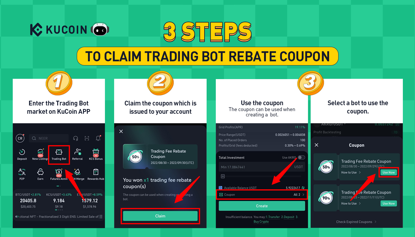 在大多數情況下,市場是波動的。KuCoin交易機器人 非常適合這種情況,因為它們將 24/7 全天候持續利用市場流量進行套利。無論價格漲跌,您都可以在任何方向獲利!立即獲得創建機器人的機會!