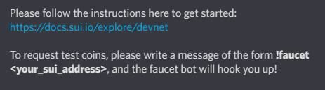- 第 3 步 加入 Sui Discord社區。以“!faucet <your sui address>”的形式將您的錢包地址發送到“devnet-faucet”頻道。然后機器人會將 Sui 測試代幣發送到您的地址。