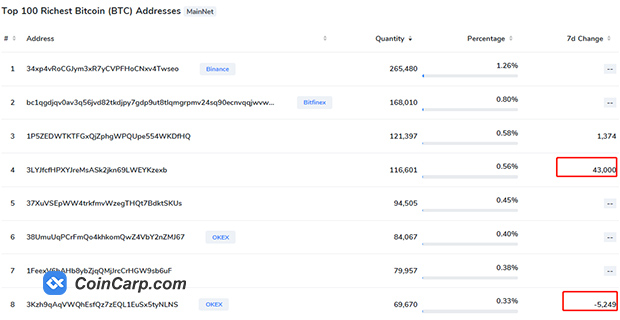 以比特幣為例,我們可以在 Coincarp 上查看前 100 個最富有的比特幣(BTC)地址,它顯示了持有比特幣數量和 7 天變化的 100 個最富有的地址,我們可以得到加密鯨魚地址的變化。