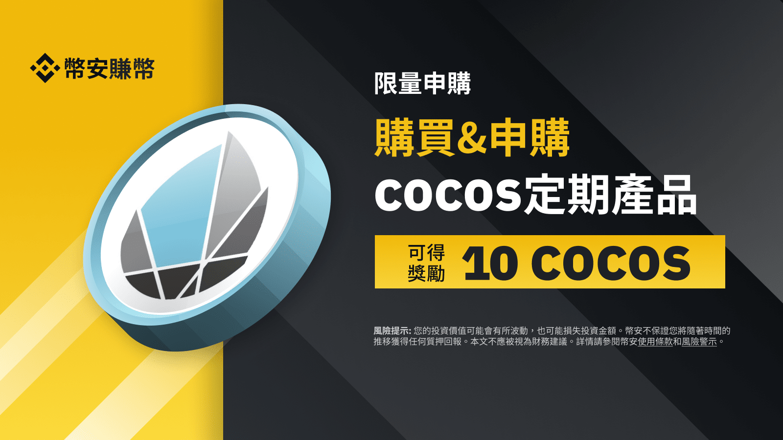 活动:购买并申购COCOS定期产品,可获得 10 COCOS 代币券