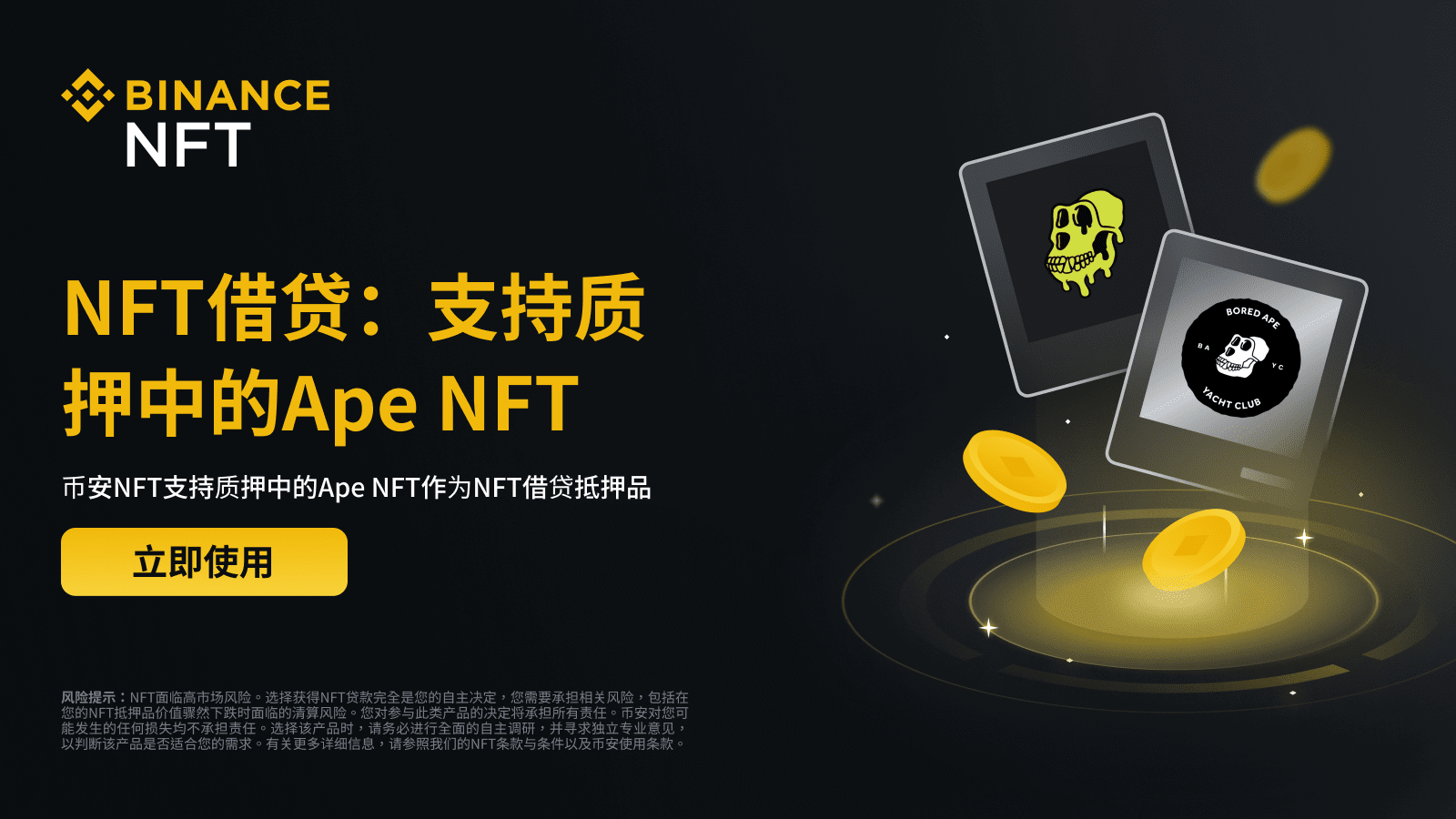 只有完成身份认证的用户才有资格使用NFT借贷并参与Ape NFT质押计划。未完成身份认证的用户、非法批量注册的账户持有人和来自受限国家/地区的用户不得参与。 有关更多信息,请参阅币安使用条款、币安NFT市场条款、币安NFT质押条款。