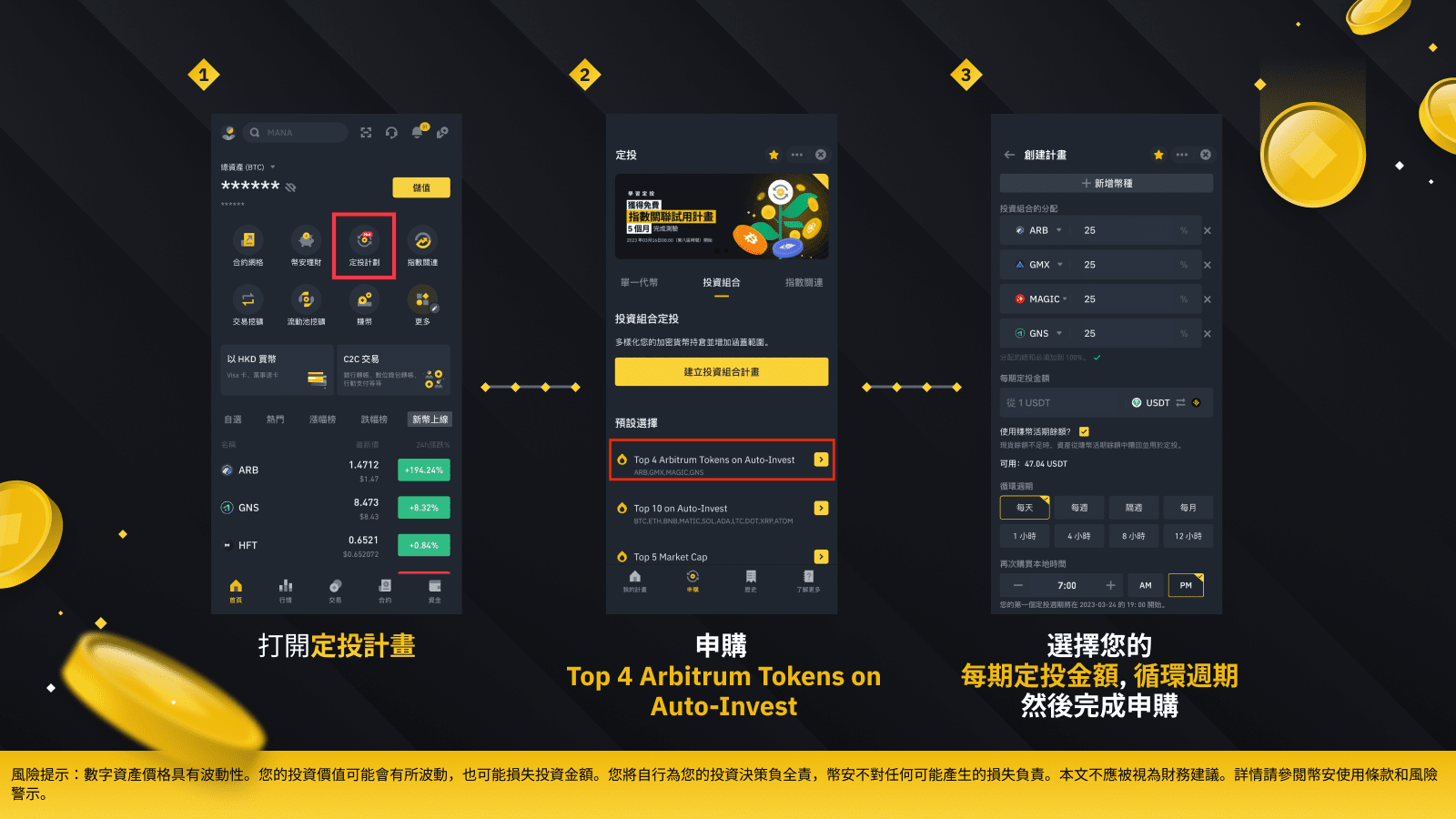 用户现在可以使用单一代币计画或投资组合计画购买以上代币。定投用户可以在预设选项中选择“Top 4 Arbitrum Tokens on Auto-Invest”。该组合计画帮助用户通过相同的定投计画更便捷地购买ARB、GMX、MAGIC和GNS。