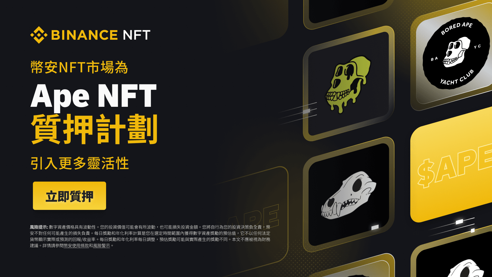 - 只有完成身份认证的用户,才有资格参与Ape NFT质押计画。未完成身份认证的用户、非法批量注册的账户持有人和来自受限国家/地区的用户不得参与。有关更多信息,请参阅币安使用条款、币安NFT市场条款和币安NFT质押条款。