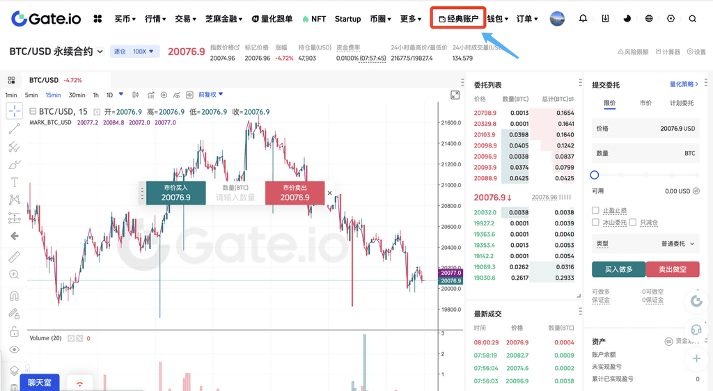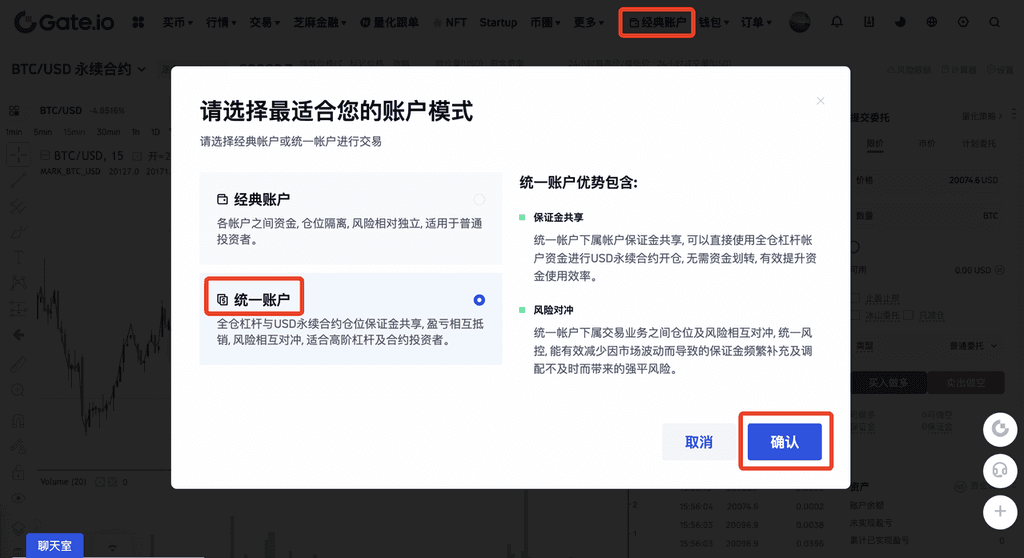 统一账户的使用:已开通全仓杠杆交易的投资者,可在USD永续合约交易内开启统一账户模式,开启后可支持经典账户/统一账户的切换使用。