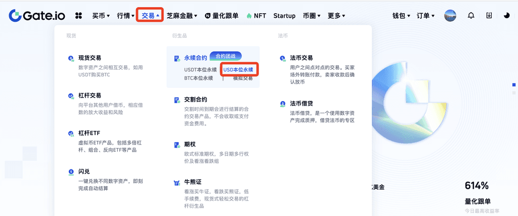 1、点击首页“交易”按钮选择“USD本位永续”;