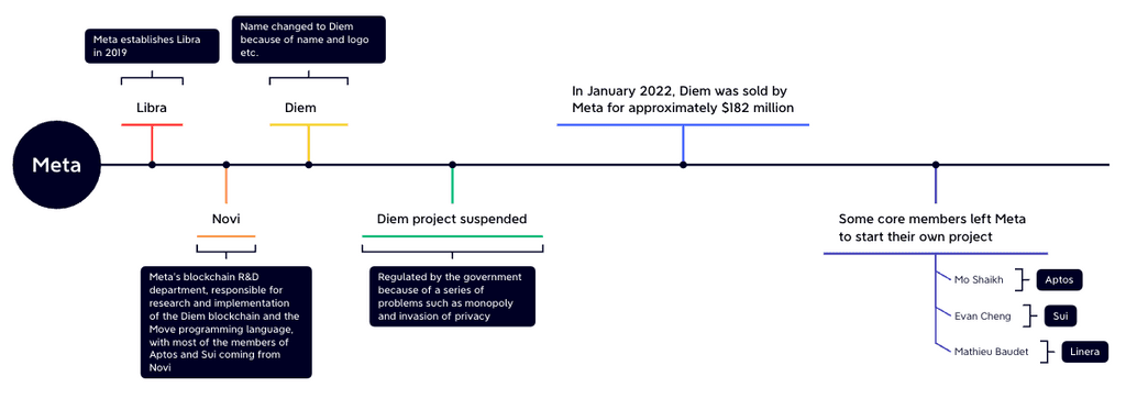 In 2019 Facebook (now Meta) started Libra, a blockchain-based payment system for licensed stablecoins. However, it was later forced to rename Diem, but its tortuous fate did not change at all with its name change.Regulators from US and EU force it to suspend on the grounds of invasion of antitrust laws and privacy. As a result, several qualified technical staff began to leave the project, including Mo Shaikh and Evan Cheng, who later set up their teams and launched Aptos and Sui separately based on Diem.