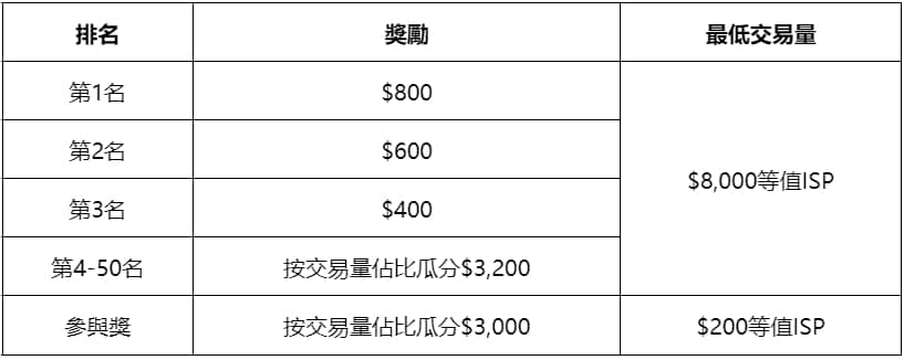 所有合格参与用户均可根据交易量瓜分$8,000等值ISP奖池。