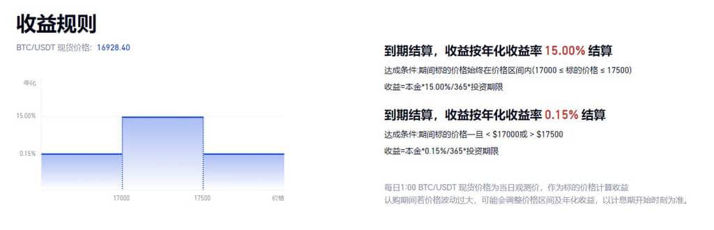 看跌宝有3种盈利方式:**-第一种:**在观察期间,目标资产价格始终未超出价格区间(即命中区间),用户可以获得较高年化收益率(保本收益率<最终收益率≤最高收益率)。结算时,目标资产价格越接近价格区间下限,年收益则越高。**-第二种:**在观察期间,目标资产价格曾经低出价格区间下限且始终小于价格区间上限(即向下敲出区间),则用户获得中档收益率。**-第三种:**在观察期间,目标资产价格一旦超出过价格区间上限(即向上敲出区间),则用户获得保本收益率。