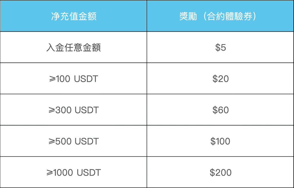 ###📌活动三:新人交易礼,瓜分$20,000奖励活动期间,新注册用户充值後完成一笔现货交易≥100 USDT或完成首笔合约交易≥1,000 USDT,即可获得 $10 - 100 合约体验券奖励,总奖池$10,000,累计交易量排名前500的用户,还将按交易量排名瓜分$10,000奖励。数量有限,先到先得!