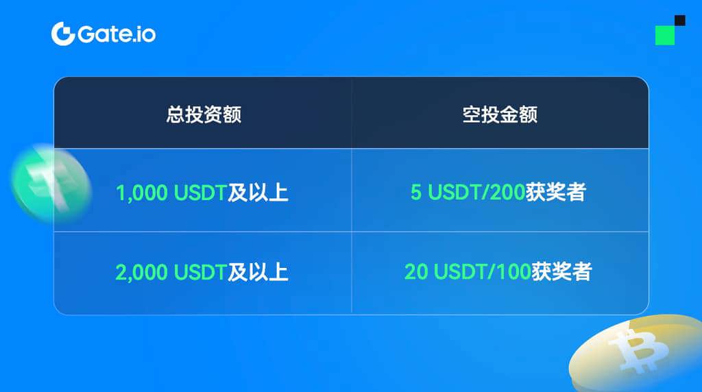 活动二:投越多,盈利越多,瓜分3,000 USDT!活动期间,首次创建合约网格,投资额大于1,000 USDT,并成功套利5次以上,有机会获得5 USDT的空投;投资额大于2,000 USDT,并成功套利5次以上,有机会获得20 USDT的空投。规则如下: