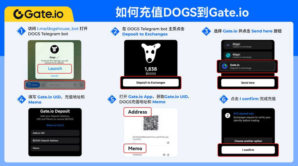 1.点击访问DOGS电报机器人 http://t.me/dogshouse_bot2.在 DOGS Telegram Bot 主页点击Deposit to Exchanges3.选择Gate.io并点击Send按钮4.填写 Gate.io UID、充值地址和 Memo5.访问 Gate.io App,获取Gate.io UID、DOGS充值地址和Memo6.点击确认完成充值