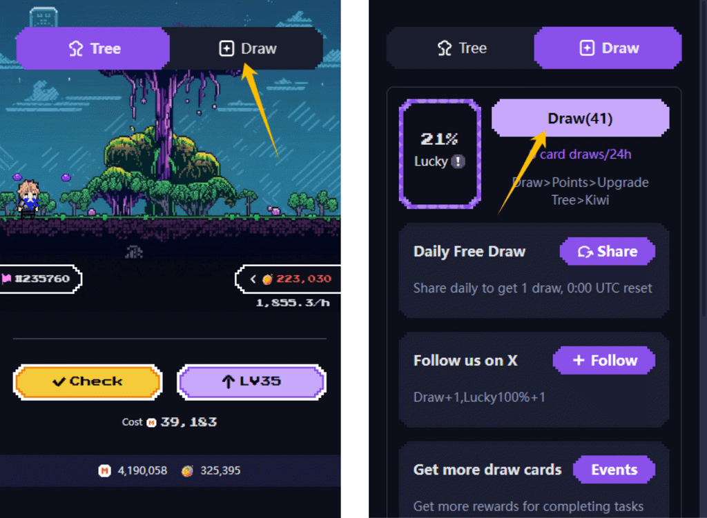 打开任务链接,找到游戏【Kiwi Tree】,点击游戏页面内的【Draw】进行抽卡。