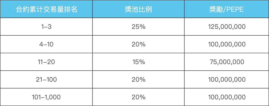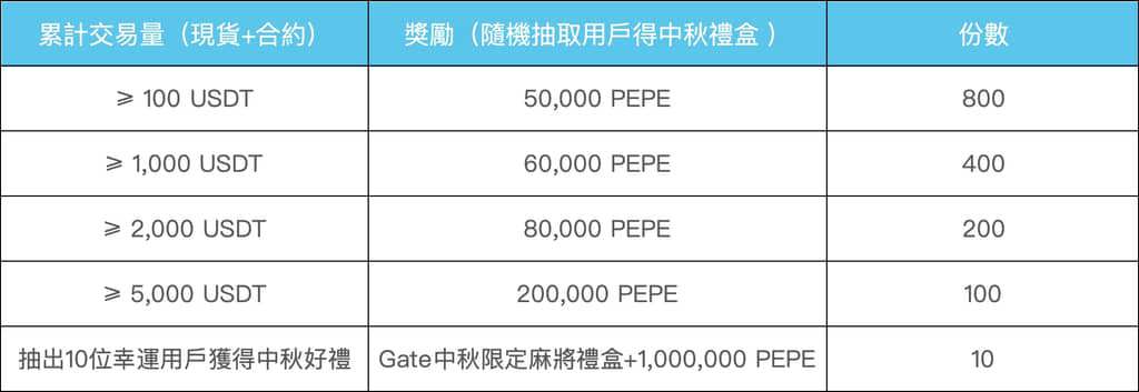 ###📌活动三:中秋交易回馈,新老用户赚500,000,000 PEPE活动期间,新老用户合约累计交易量 ≥ 5,000 USDT,即可参与瓜分**500,000,000 PEPE **中秋团圆礼,先到先得!奖励详情如下: