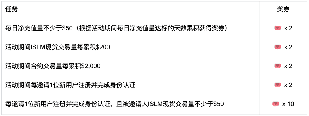 活动规则:1、所有参与者需完成身份认证才可领取奖励。2、交易量=买入量 卖出量。3、净充值 = (充值 法币买入) - (提现 法币卖出),充值仅限链上充值,站内转账和站内充值不计入在内。净充值数据将于每日07:59(UTC 8)更新。4、本活动奖励为ISLM,总奖池为490,113 ISLM。用户活动期间需完成任意 ISLM 现货交易量,才可参与瓜分奖券奖池。奖励将于活动结束后14个工作日内发放至获奖者钱包账户中,可在“钱包—账单”中查看。奖励分发公告可在Gate.io News频道查看。5、严禁批量注册小号,恶意刷量、自买自卖、相互对敲等作弊行为,同一认证用户的多个账号将视为同一账号。6、做市商、企业、机构、代理商账户不可参与本次活动。7、用户若同时参与同一时期举办的多场活动,活动奖励不支持重复领取,仅支持领取单场活动奖励。8、如翻译版本与英文版本有任何差异,以英文版本为主。9、Gate.io拥有对本次活动的最终解释权。10、此活动与苹果公司无关。11、英国以及其他受限地区的使用者无法使用全部或部分服务(包括参与本活动、游戏或竞赛), 有关受限地区的详细资讯请阅读User Agreement。请注意我们无意向此类受限地区的客户进行招揽或行销。