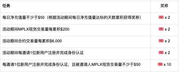 活动规则:1、所有参与者需完成身份认证才可领取奖励。2、交易量=买入量 卖出量。3、净充值 = (充值 法币买入) - (提现 法币卖出),充值仅限链上充值,站内转账和站内充值不计入在内。净充值数据将于每日07:59(UTC 8)更新。4、本活动奖励为MPLX,总奖池为45,360 MPLX。用户活动期间需完成任意 MPLX 现货交易量,才可参与瓜分奖券奖池。奖励将于活动结束后14个工作日内发放至获奖者钱包账户中,可在“钱包—账单”中查看。奖励分发公告可在Gate.io News频道查看。5、严禁批量注册小号,恶意刷量、自买自卖、相互对敲等作弊行为,同一认证用户的多个账号将视为同一账号。6、做市商、企业、机构、代理商账户不可参与本次活动。7、用户若同时参与同一时期举办 的多场活动,活动奖励不支持重复领取,仅支持领取单场活动奖励。8、如翻译版本与英文版本有任何差异,以英文版本为主。9、Gate.io拥有对本次活动的最终解释权。10、此活动与苹果公司无关。11、英国以及其他受限地区的使用者无法使用全部或部分服务(包括参与本活动、游戏或竞赛), 有关受限地区的详细资讯请阅读User Agreement。请注意我们无意向此类受限地区的客户进行招揽或行销。