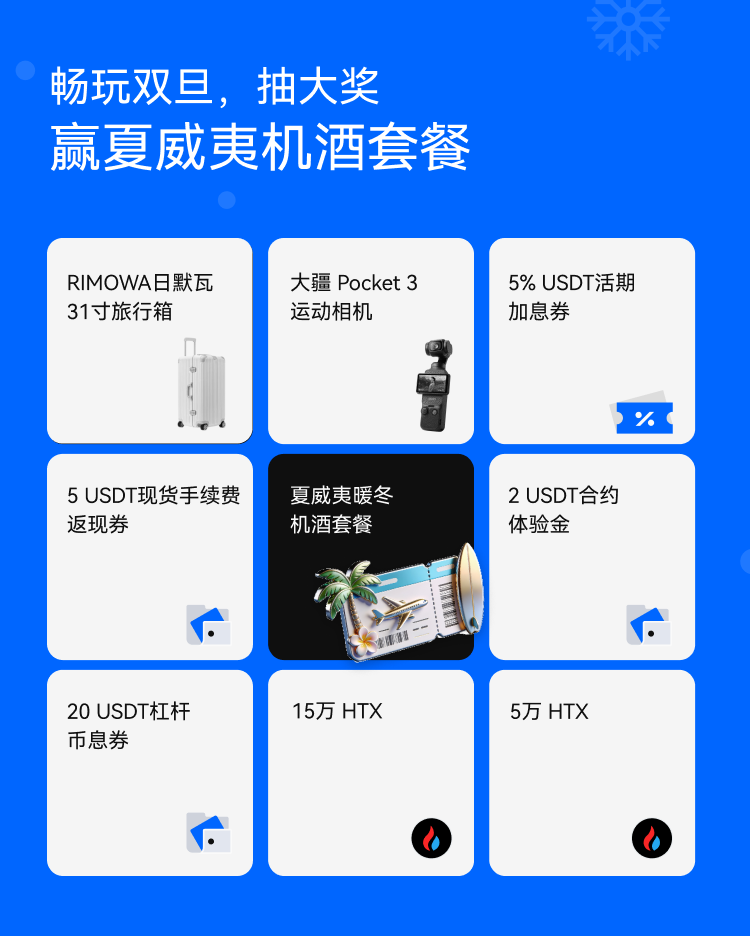 在这充满温暖与期盼的节日季,火币HTX特别推出双旦畅玩惊喜——抽奖转盘活动。参与用户只需完成简单任务,就有机会抽取夏威夷暖冬机酒套餐!还有RIMOWA日默瓦旅行箱,大疆 Pocket 3运动相机,诸多豪礼等你抱回家。