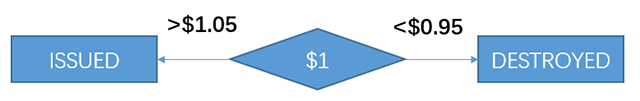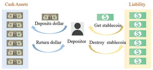 - 链下抵押资产,例如 Tether,需要托管人对货币进行监管,然后储备一定数量的抵押品。Tether Ltd. 在银行账户中持有美元,持有的金额必须等于他们发行的 USDT 以维持系统的秩序。通过这种方式,可以防止价格波动。如果有人拥有数字美元并要求返现,持有者将获得实物美元,相应的稳定币将被销毁。