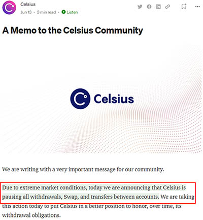 Celsius网络是成立于 2018 年的全球顶级加密借贷和生息收益平台之一。Celsius声称他们是一个民主化的利息收入和借贷平台,就像建立在区块链上的银行一样。Celsius曾有过其高光时刻,去年11月筹集了7.5亿美元的资金,而且资产管理规模曾经超过300亿美元。根据其官方网站,截至 5 月 17 日,Celsius 已处理超过 80 亿美元的贷款、拥有200 万社区成员和 110 亿管理资产。但是,6 月 13 日,Celsius 宣布暂停所有账户之间的提款、Swap 和转账。